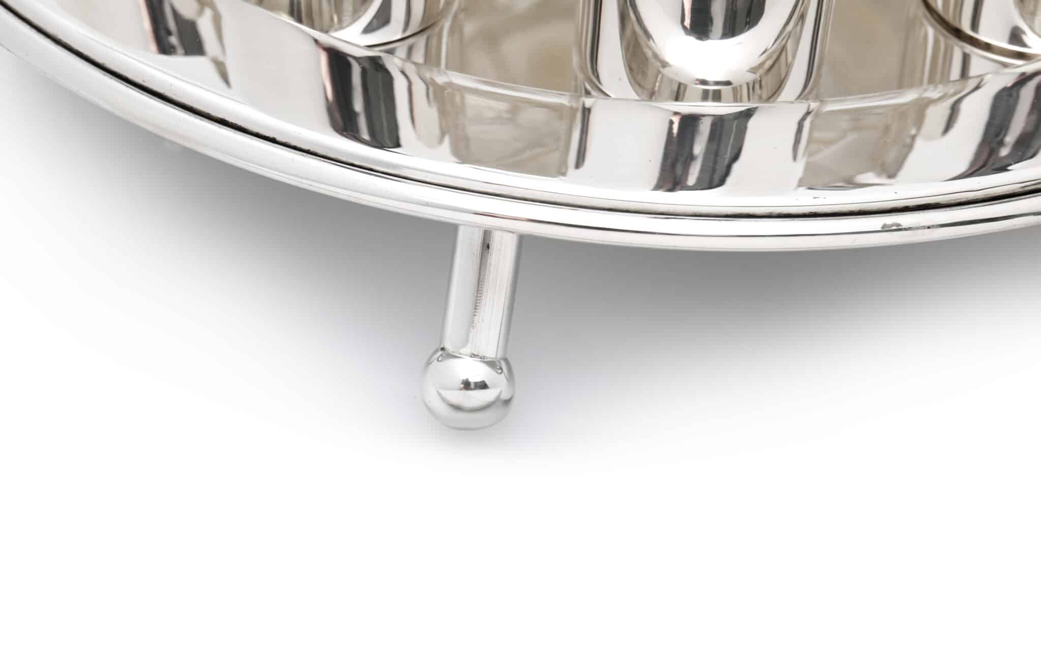 This modern Judaica centerpiece features a sleek and elegant shape, and ten matching goblets placed around a central column that pours wine evenly and cleanly.