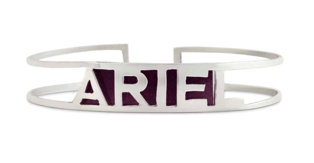 This superb minimalist name bracelet is ideal for men and women. It’s handmade in Israel from fine 925 sterling silver and comes with a choice of enameled background. Your name is displayed between two silver bands in stylish handcrafted silver letters. This name bracelet is a great Bar Mitzvah/Bat Mitzvah gift and superb item of personal jewelry.