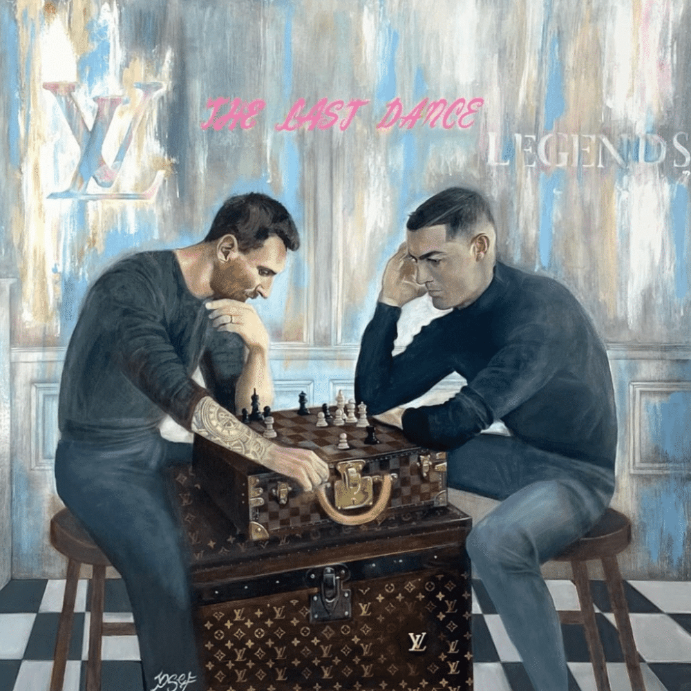 Dive into the mesmerizing football universe with this beautifully crafted acrylic masterpiece. Experience the genius of Messi and Ronaldo as they engage in a game of chess, artistically portrayed on canvas.