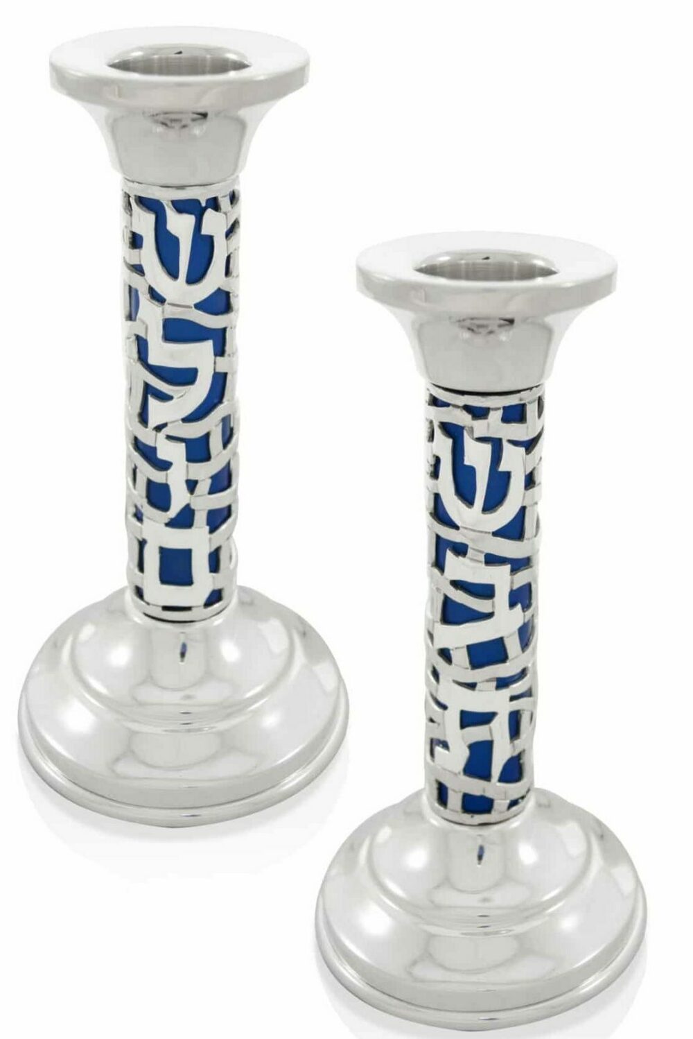 A unique 925 Sterling silver floral candlesticks with smooth shiny finish. The body of the candlesticks is created out of cut-out designs, with the Hebrew letters spelling out ‘Shabbat Shalom’ peeking out between the lines, filled with a colorful pillar, connecting a silver tiered base to an elegant silver top. A stunning gift for Shabbat, Holidays, a wedding or bar mitzvah. Watch the light of your Shabbat A matching tray can be added to complete the set.