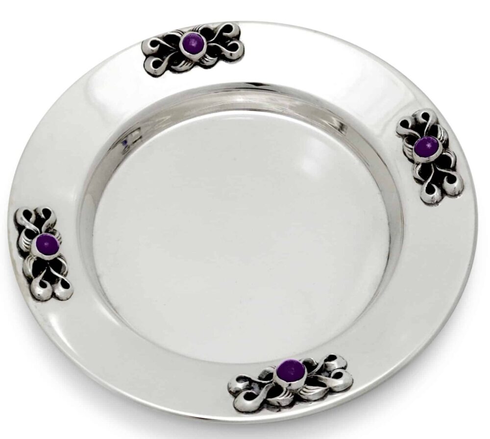Sterling Silver Decorated Plate for Kiddush with Amethyst